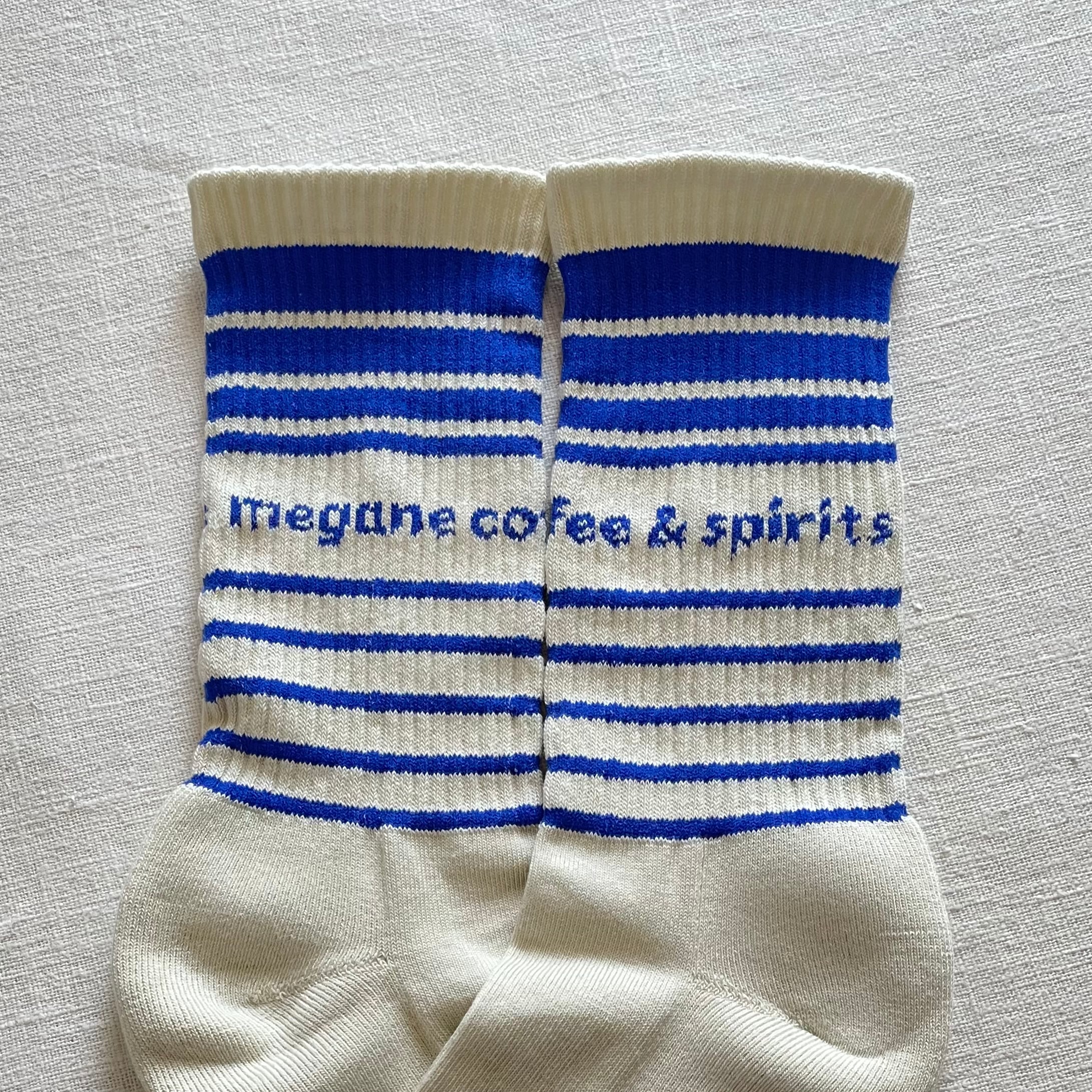 国内生産のオリジナルソックスです。ボディカラーはエクリュ(生成り)。太さの異なるブルーのストライプにmegane coffee & spirits のロゴが刺繍されています。レッグは程よい伸縮性があり、 足底はパイル仕様で耐久性にも優れます。適度な厚みでオールシーズン対応。スポーツにもピッタリです。ゴムは少々キツめかもしれません。