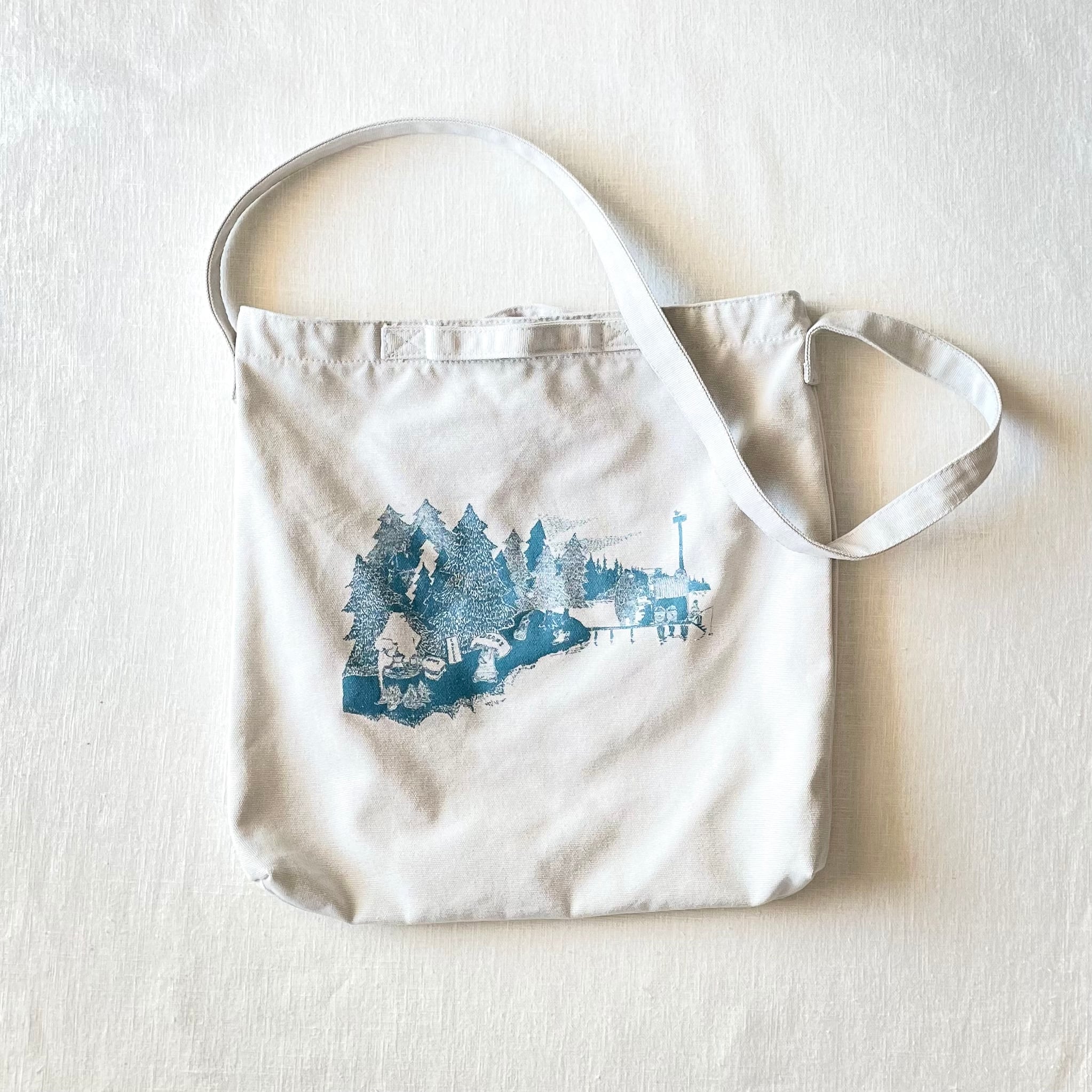しっかり目の厚手のキャンバス生地(14.3オンス)を使った2WAYショルダーバッグです。グレーの生地にブルーグレーのプリントです。イラストは、バリスタでありイラストレーターでもある coffee sazanami の浦川洸一郎さんに描き起こしてもらった3周年トートと同じですが、年数表記が入っていません。裏面は無地です。